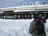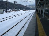 暖かい車内で、しかもゆっくりと冬景色を楽しみながらの電車の旅は至福の時です。近江塩津では20分の待ち時間です。さすがに寒い。ここはホームが高い所にある、何故だろー?細く長い階段を下りていくと改札には誰もいません。無人駅?さきの子供ずれの親子が雪合戦をしている。外には出られない決まりのはず・・でも少しの間駅の周りを楽しませてもらいました。