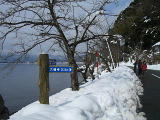 海津の町の東外れから海津大崎辺りまで、4Kmにわたり約600本のソメイ吉野の桜並木がつずいている。春には絢爛豪華な景観を見せて『日本の桜名所100選』にも選ばれているが・・なんと、かわいそうに雪の重さに耐えかねて多くの枝が折れている。樹齢70年だという。