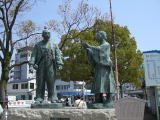 冬の長浜に来た時・空はどんよりと曇り、寒く暗い街だと思ったが、なんと今日は、空は晴れ渡り、街は晴れやかに、賑わっている。お祭りだ。まず駅を出て、秀吉と石田三成出逢いの像を左にとると
