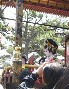 長浜八幡宮・・へここで長浜曳山祭りのメーンイベントの子供歌舞伎が曳山の上で演じられている。役者は全て男の子で、祭礼一ヶ月前から稽古が始まると、いう。なんと一ヶ月で大人顔まけの演技が出来るとは・・・曳山博物館で子供狂言の歴史や長浜の真髄を知る。 大通寺・・黒壁スクウェア・・長浜鉄道スクエア・・と行きたい、見たい所があるが・祭りの主役である子供歌舞伎を追っかけて、時間が無い。短い時間では本当の長浜を知る事は出来ないようだ。