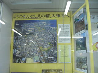 西大津駅から大津京と駅名が変わり、かって大津に都があったことをアピールするためと、琵琶湖の湖底から発掘された遺跡を紹介する展示がJR大津京駅のコンコースで始まっている。