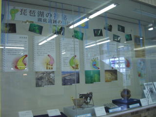 琵琶湖に約100件ある湖底遺跡の中から代表的な4遺跡の場所や歴史をパネルで解説し、出土した土器や、通貨、刃物などの遺物が並んでいる。大中の湖南遺跡(安土町)から出た『正面全身人形)は、個人の罪を封じ込めて内湖に流された、祭祀用の道具とある。