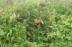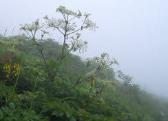 気候の接点にあるため、約300種の植物があり、伊吹山にしか見られない固有種も多く、名前に『イブキ』を冠する植物も多い。山頂までの道は霧でぬれ、歩きにくい。色鮮やかなピンクのシモツケソウや黄色いメタカラコウ・シシウド・ルリトラノオ・かわいい姫ナデシコなどが薄靄の中に浮かびなんとも幻想的です。