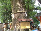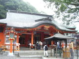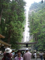 ここは絶好の写真スポットである。隣には、熊野那智大社がほとんど同居の形に建っており、社殿のまえには樹齢八百年の楠があり、しめ縄をはりめぐらして、そびえている。いきなり雨がおちてくる。滝の水量が多いのを納得しながら、バスへ・帰路へ。