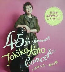 彼女には時が止まっているような若々しいお登紀さんの登場に又驚く。ステージは過去と未来をつなぐこと、それが45周年のテーマとのことで、琵琶湖周航の歌に始まり・さくらんぼの実のる頃・枯葉・ミラボー橋の下でと彼女の原点であろう古いシャンソンをききながら、