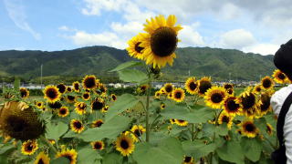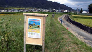 今回の花散歩は「エ―ッ今頃」と「やっぱり今」の2本立てです。と案内をもらう、まず、京都・大原野では「えっ? 今頃ひまわり大原野」と銘打って、九月中旬の最盛期を目指したヒマワリ畑が開設されている