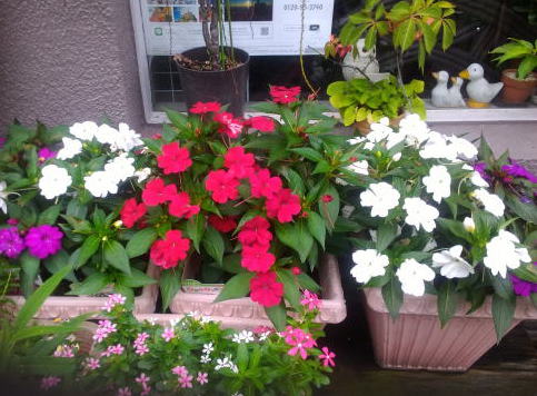 今年の店の前は暑さにも負けず色あざやかな花が咲き誇っています。